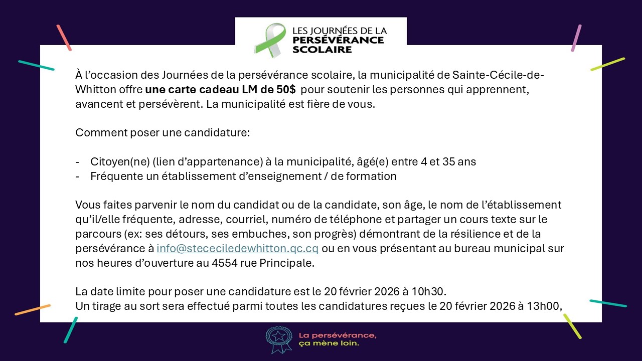 4554, rue Principale Sainte-Cécile-de-Whitton (Québec) G0Y 1J0 Tél: (819) 583-0770 Fax: (819) 583-0518 info@stececiledewhitton.qc.ca