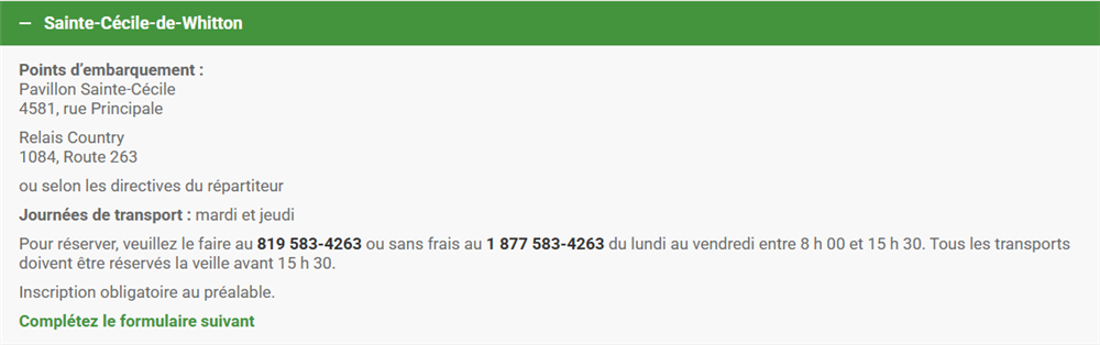 L'inscription est obligatoire et gratuite. Les formulaires sont disponibles à la municipalité, à la MRC du Granit et Trans-Autonomie. Visitez la page Web pour plus d'informations : http://www.mrcgranit.qc.ca/fr/services-aux-citoyens/transport-collectif/